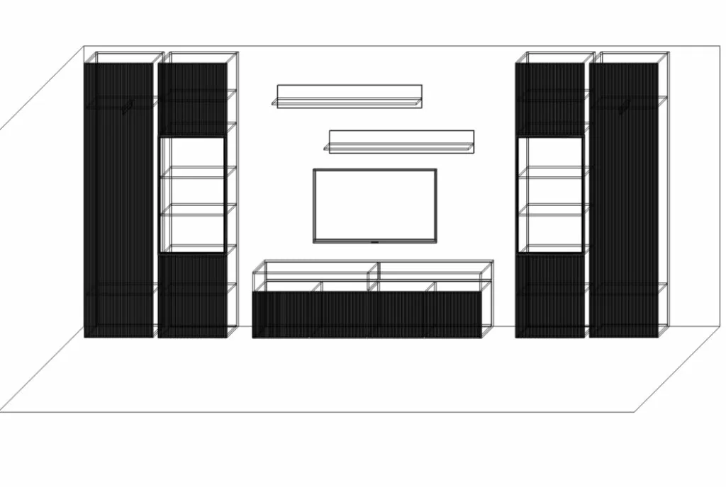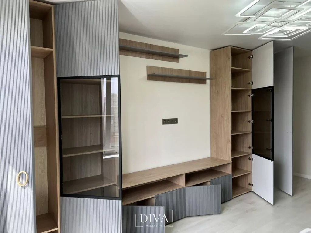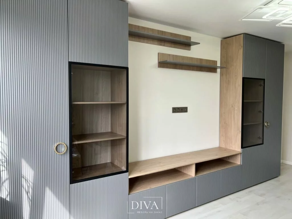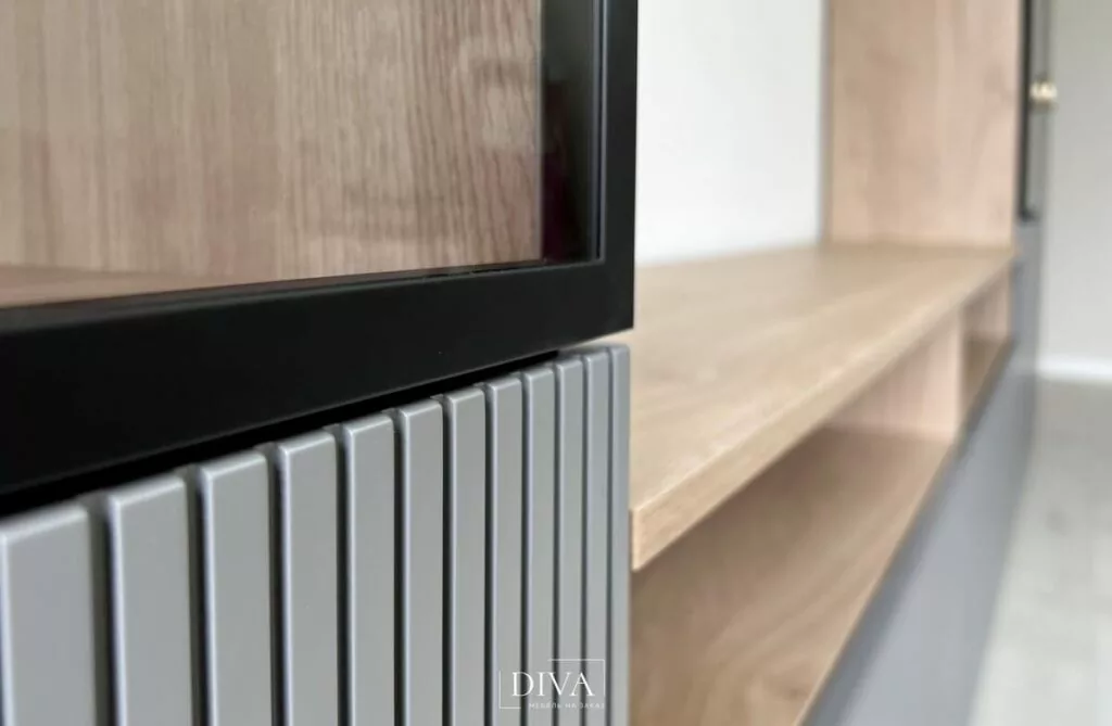 Клиент уже заказывал у нас эмалевую кухню, посмотрел на качество нашей мебели и работы, и в этот раз доверил нам реализацию гостиной, рабочей зоны и большого комода в спальню.